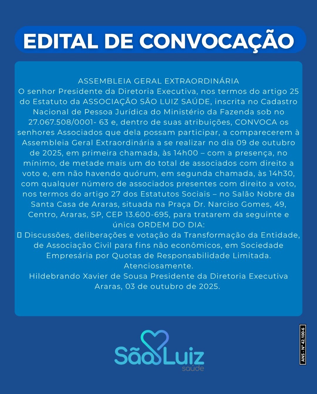 Para isso, a entidade convocou seus associados para uma Assembleia Geral Extraordinária no dia 9 de outubro de 2025, no Salão Nobre da Santa Casa de Araras. A primeira chamada está prevista para as 14h, com a exigência de quórum de metade mais um dos associados com direito a voto. Caso não seja atingido, haverá segunda chamada às 14h30, podendo ser realizada com qualquer número de participantes.