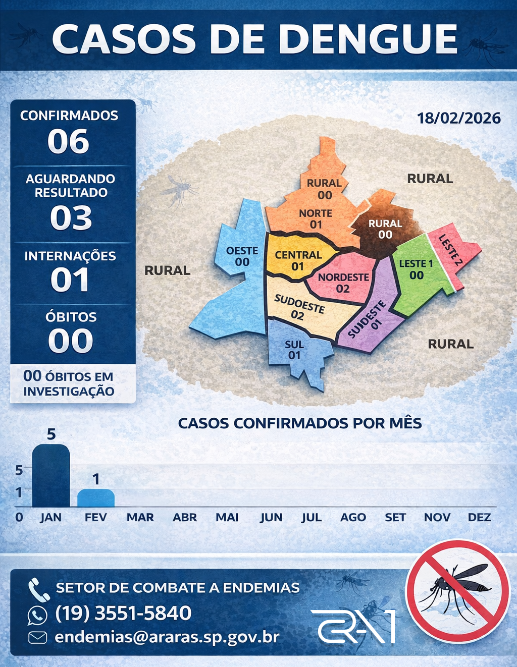 De acordo com a Secretaria da Saúde, em 2026 foram confirmados até o momento seis casos da doença — cinco deles contabilizados em janeiro. Em fevereiro, apenas um caso de dengue foi registrado no município.