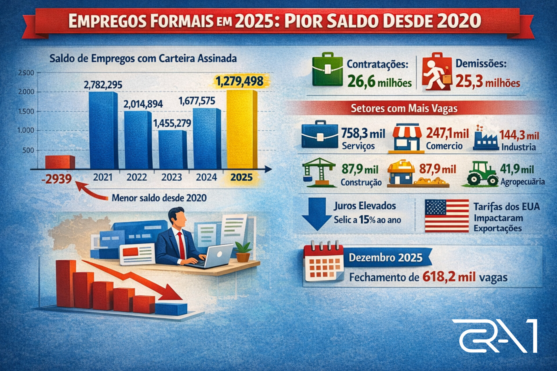 O Brasil registrou a criação de 1.279.498 empregos com carteira assinada em 2025, segundo dados divulgados nesta quinta-feira (29) pelo Ministério do Trabalho e Emprego. O resultado é o pior saldo anual desde 2020, ano marcado pela pandemia da Covid-19, quando houve fechamento líquido de vagas formais.
