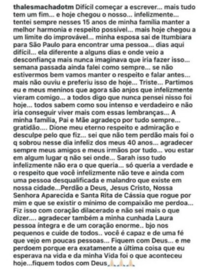 Antes da tragédia, Thales deixou uma carta direcionada a familiares e amigos. No texto, mencionou problemas conjugais, pediu desculpas e afirmou ter tomado a decisão em um momento que descreveu como extremo. Horas antes do ocorrido, ele também publicou mensagens nas redes sociais com declarações de carinho aos filhos. Leia abaixo: