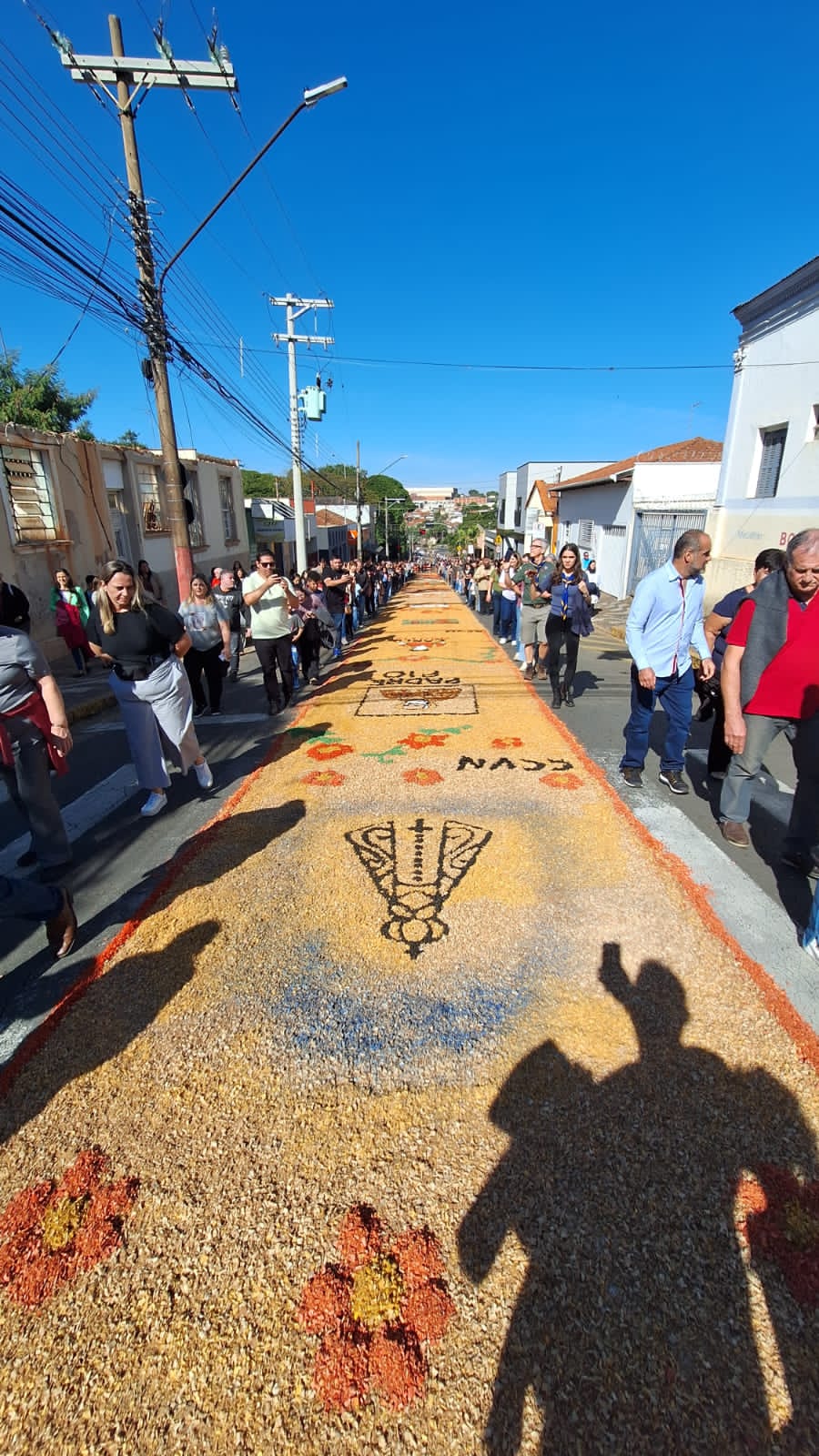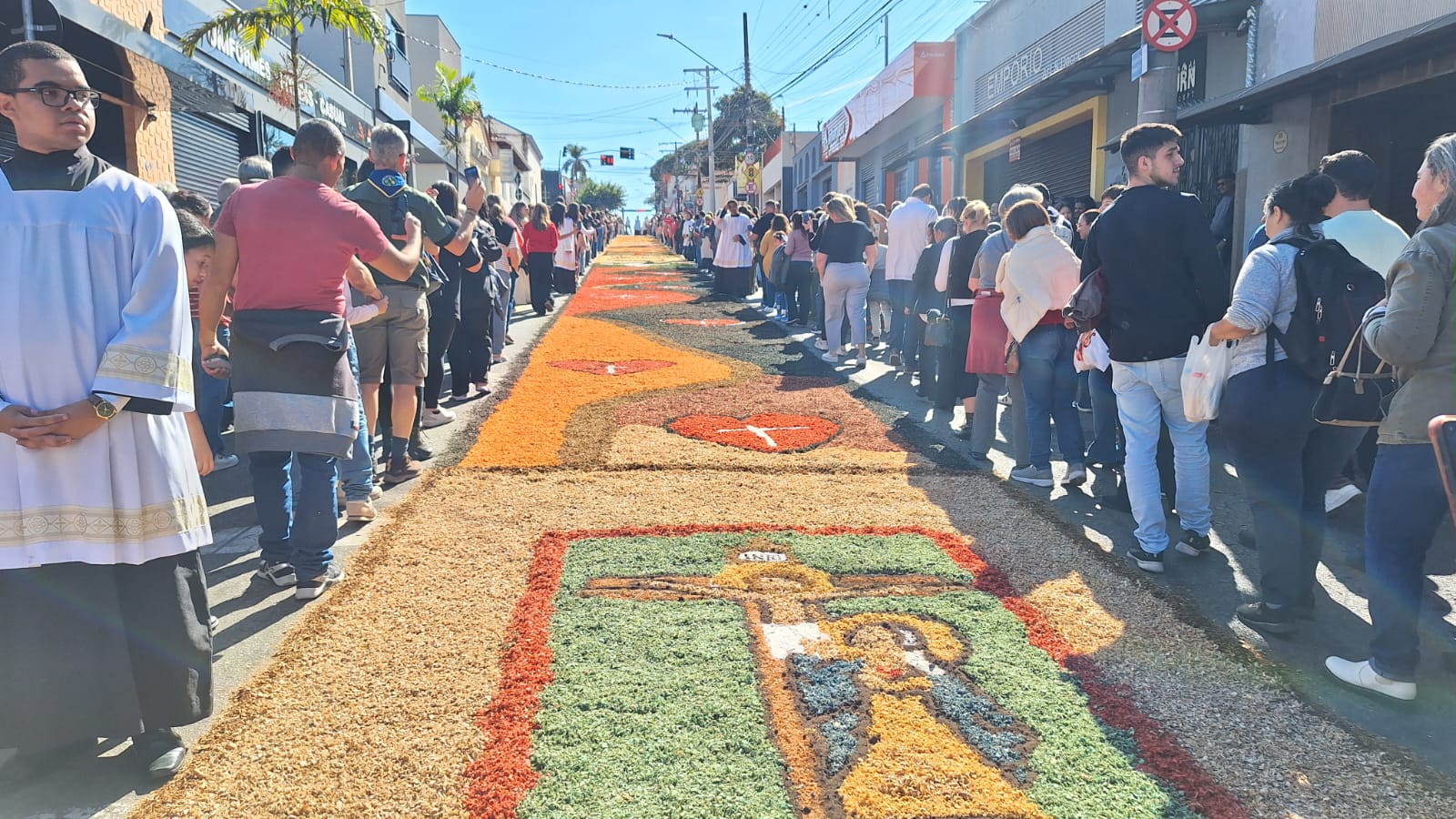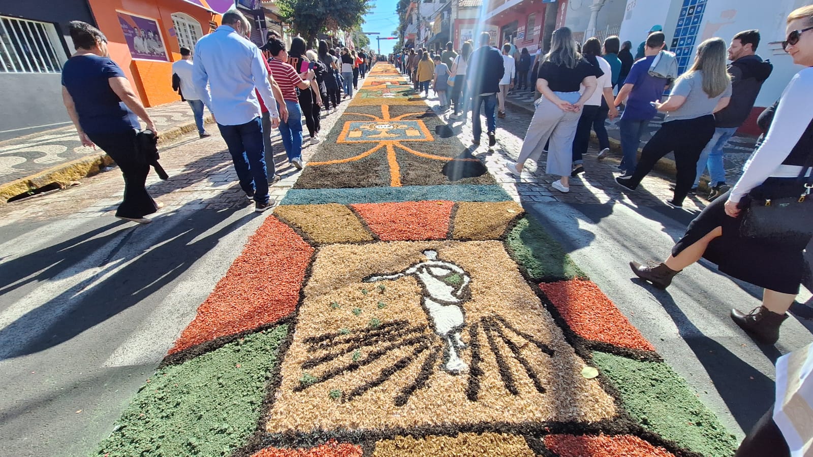 Durante o trajeto, os participantes passaram pelos tradicionais tapetes confeccionados com serragem colorida, pó de café, areia e outros materiais, formando desenhos e símbolos religiosos. A confecção dos tapetes, realizada durante a madrugada por voluntários, é uma expressão artística e devocional que faz parte da tradição católica.