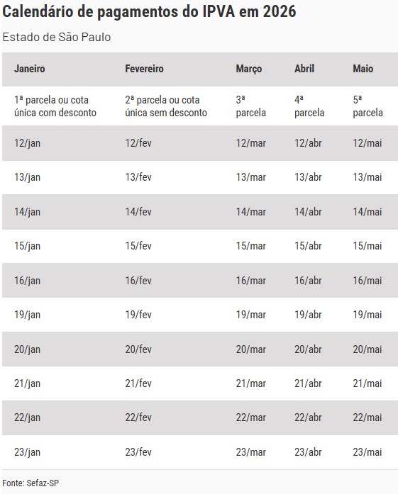 Teve início nesta segunda-feira (12) o calendário de pagamento com desconto do IPVA (Imposto sobre a Propriedade de Veículos Automotores) 2026 no estado.