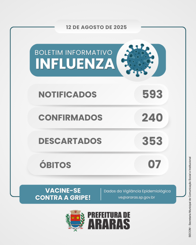 Em relação à influenza, o município contabiliza 240 casos confirmados e sete óbitos neste ano, mantendo-se estável nas últimas duas semanas. A cobertura vacinal do público-alvo — idosos, crianças e gestantes — é de 53,68%, com 41.951 doses aplicadas. As vacinas contra a gripe continuam disponíveis em todas as salas de vacinação para pessoas a partir dos seis meses de idade.