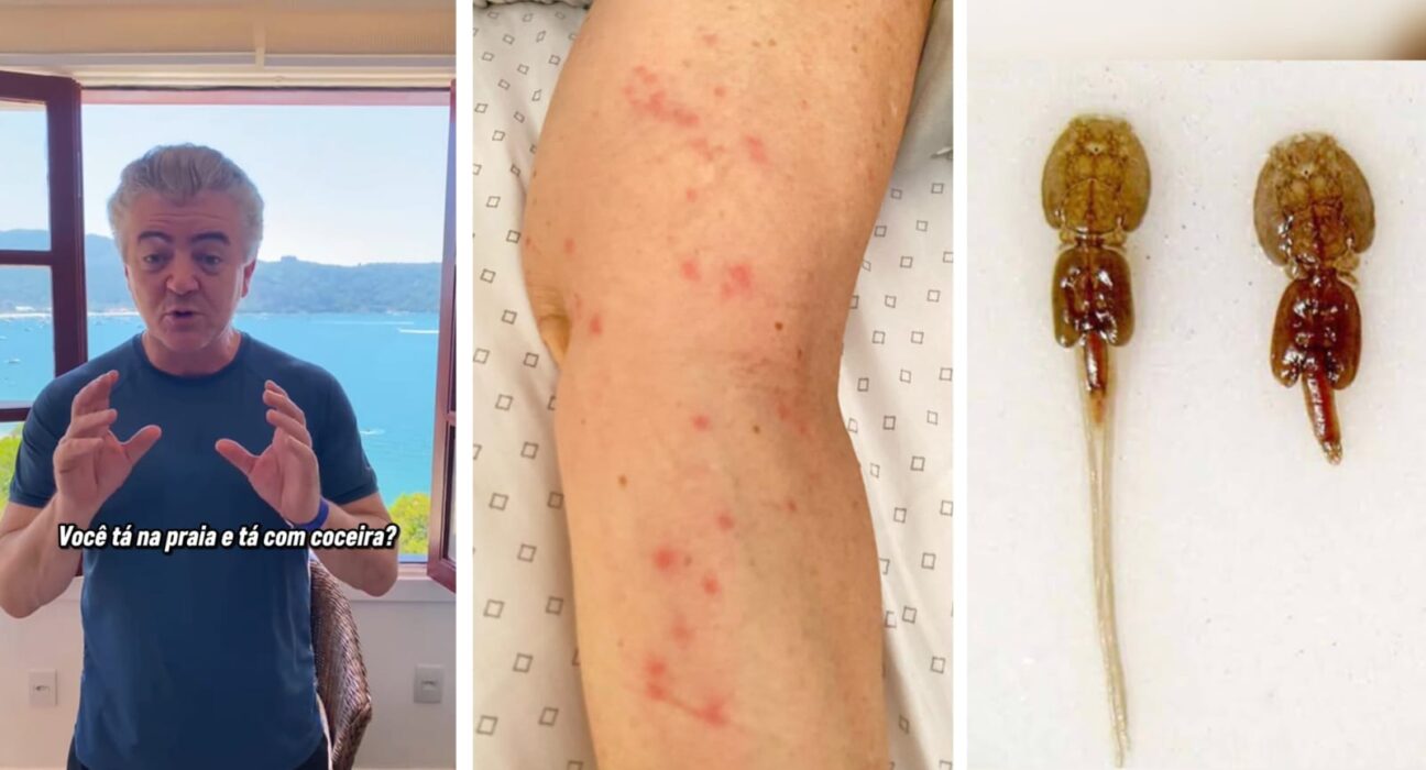 O médico cardiologista e intensivista Agnaldo Piscopo publicou um vídeo nas redes sociais alertando banhistas sobre o aumento de casos de coceira e lesões na pele causadas por larvas de águas-vivas, condição conhecida como sea lice ou erupção do banhista.
