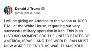 “Todos os aviões estão em segurança a caminho de casa. Parabéns aos nossos grandes guerreiros americanos. Não há outro exército no mundo que pudesse ter feito isso. AGORA É A HORA DA PAZ! Agradecemos a sua atenção a este assunto”, completou Trump.