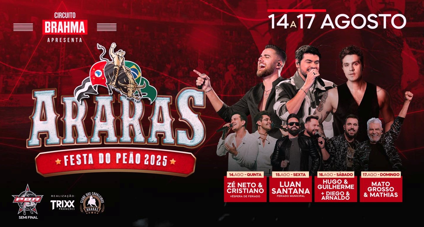 A edição 2025 da Festa do Peão de Araras começa nesta quinta-feira (14), no Parque Ecológico Municipal “Gilberto Rüegger Ometto”, e se estende até domingo (17). A abertura da programação musical será às 21h, com o show da dupla Zé Neto & Cristiano. Os portões serão abertos às 19h, e as apresentações devem seguir até próximo da meia-noite.