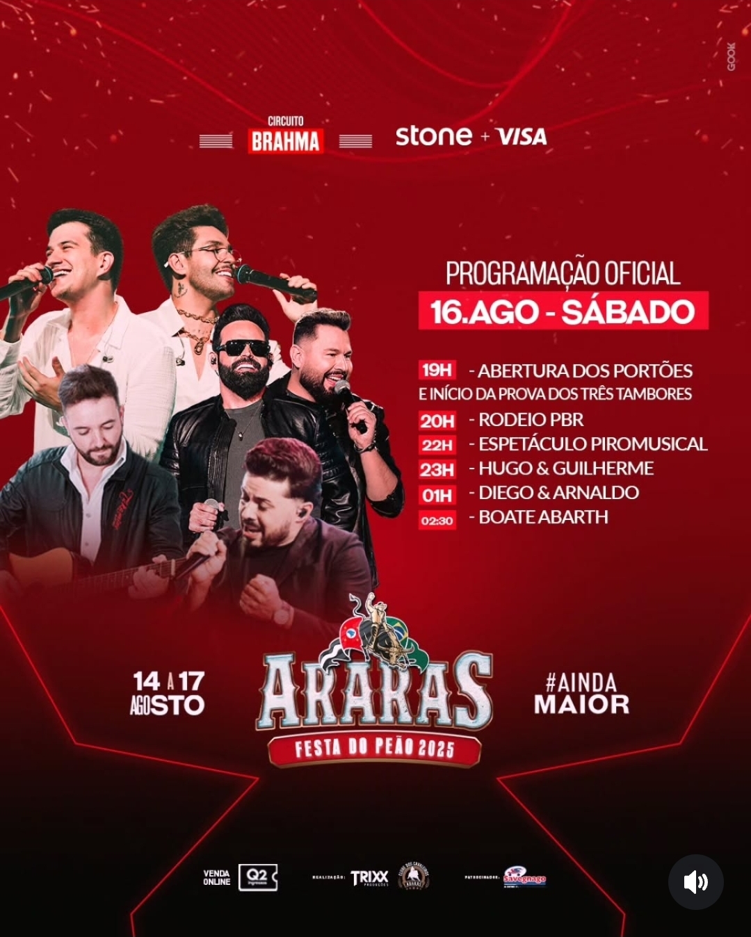 Na sequência, às 22h, o público acompanha o espetáculo piromusical. O primeiro show da noite será da dupla Hugo & Guilherme, marcada para às 23h. Já à 1h da madrugada, a animação fica por conta da dupla Diego & Arnaldo, que promete levantar a arena com sucessos do sertanejo atual.