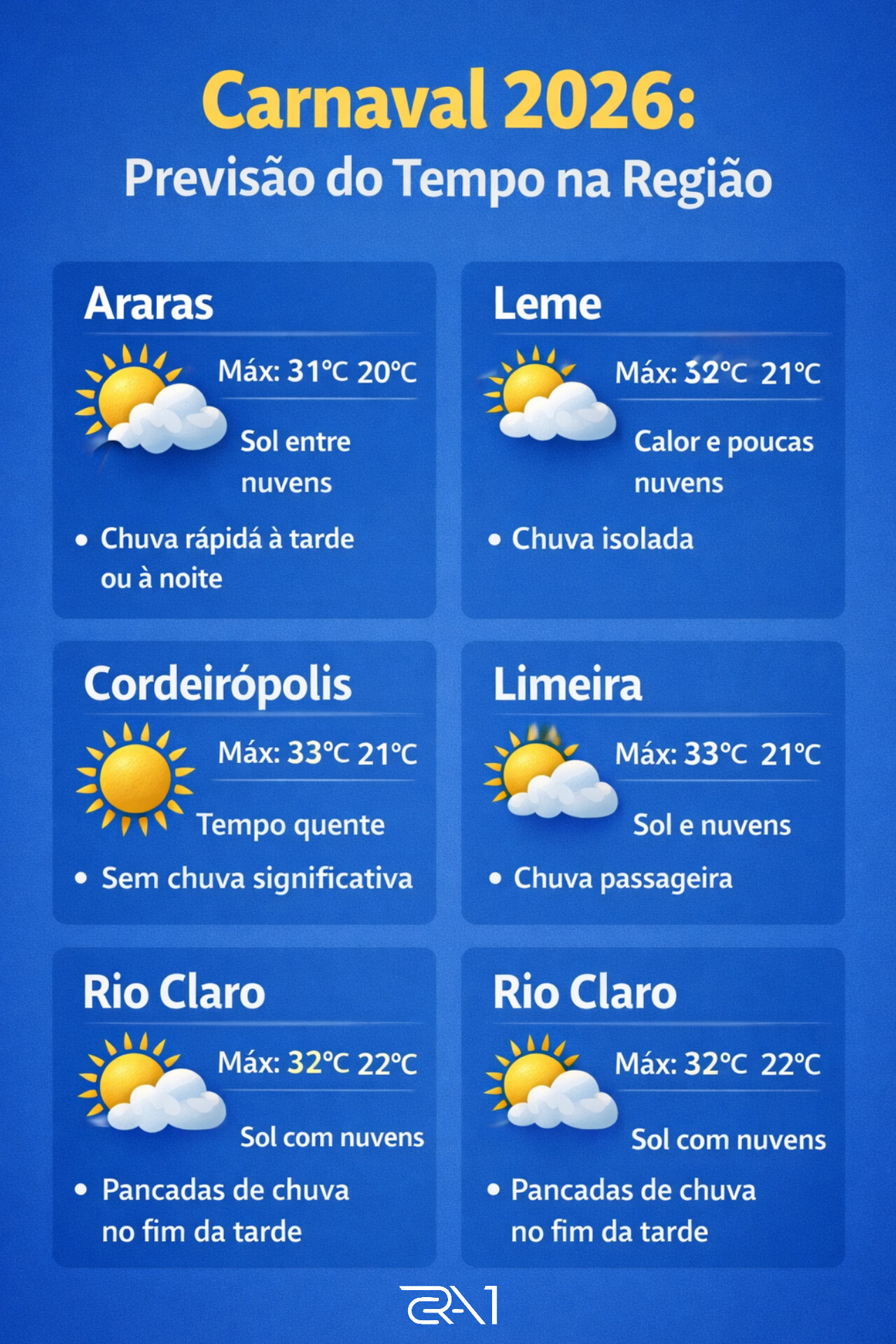 O fim de semana prolongado de Carnaval deverá ser marcado por sol, calor e pancadas isoladas de chuva em Araras e região. Entre sábado (14) e terça-feira (17), a previsão indica temperaturas elevadas durante a tarde, com máximas variando entre 30°C e 33°C em Araras, Leme, Cordeirópolis, Limeira e Rio Claro.