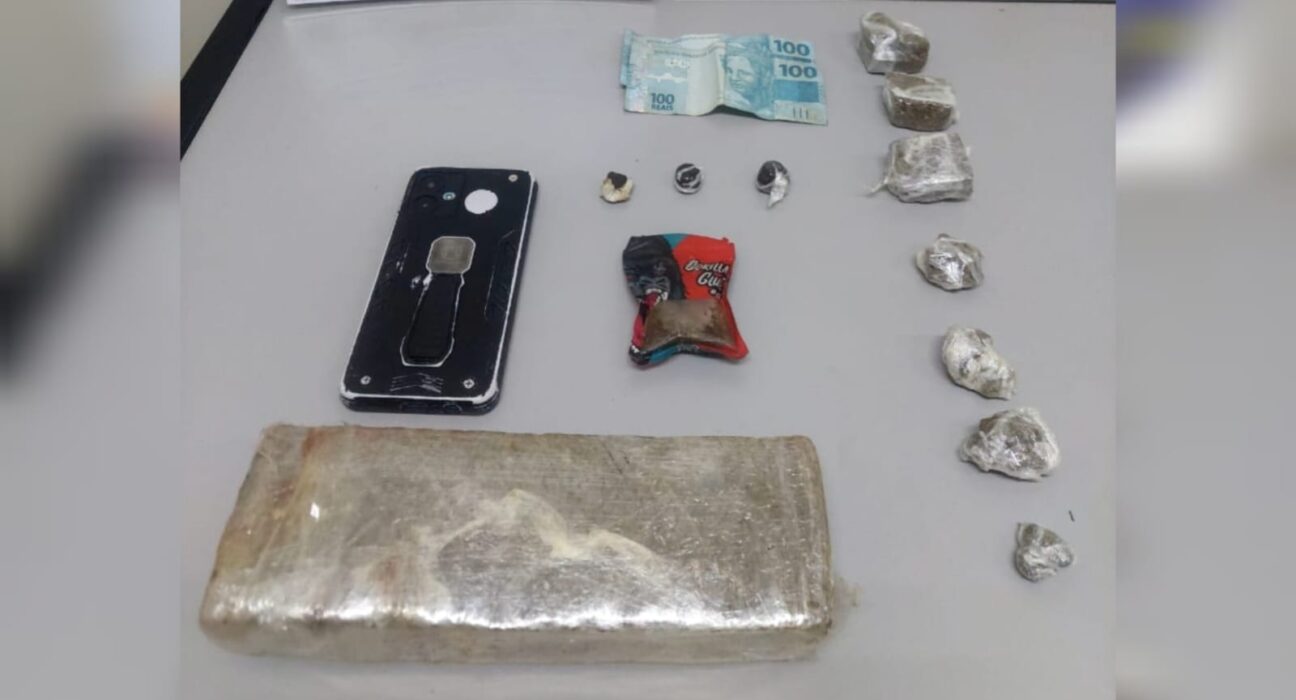 Durante a abordagem, os policiais encontraram R$ 200 em espécie e um aparelho celular com o suspeito. Dentro do carro, sob o banco do motorista, havia um estojo contendo oito porções de maconha e três de haxixe. Sob o banco do passageiro, os PMs localizaram ainda um tijolo de maconha.