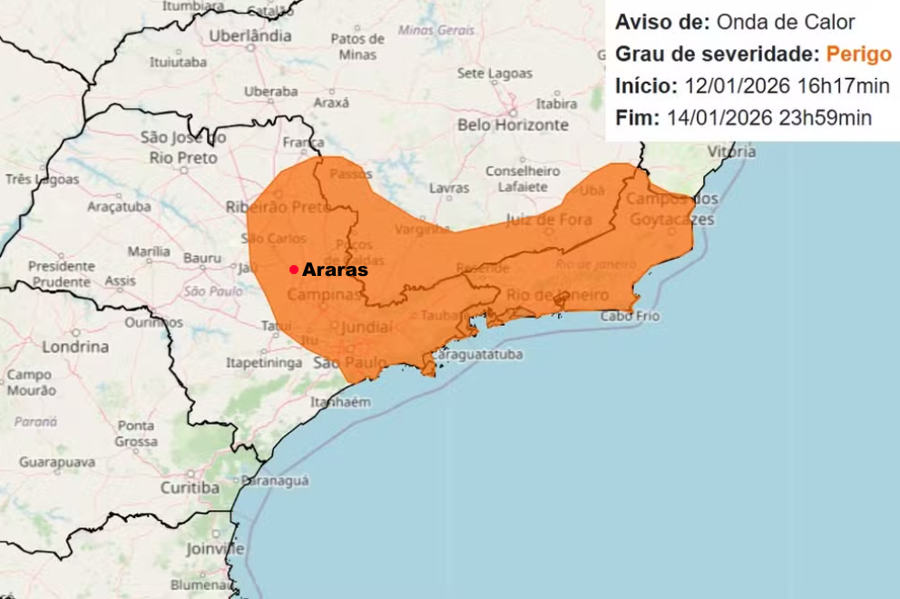 O Instituto Nacional de Meteorologia (Inmet) emitiu dois alertas para a região de Araras entre esta terça-feira (13) e quarta-feira (14): um alerta laranja de onda de calor e um alerta amarelo de perigo para tempestades.