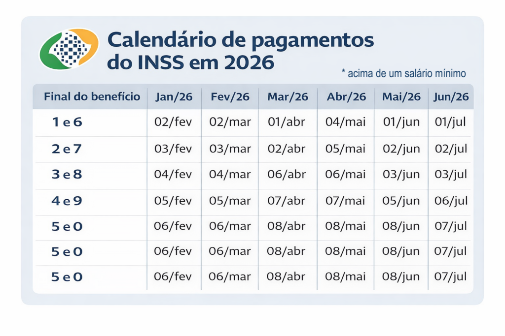 Veja o calendário de pagamentos para o 1º semestre de 2026 para quem recebe acima do salário mínimo.