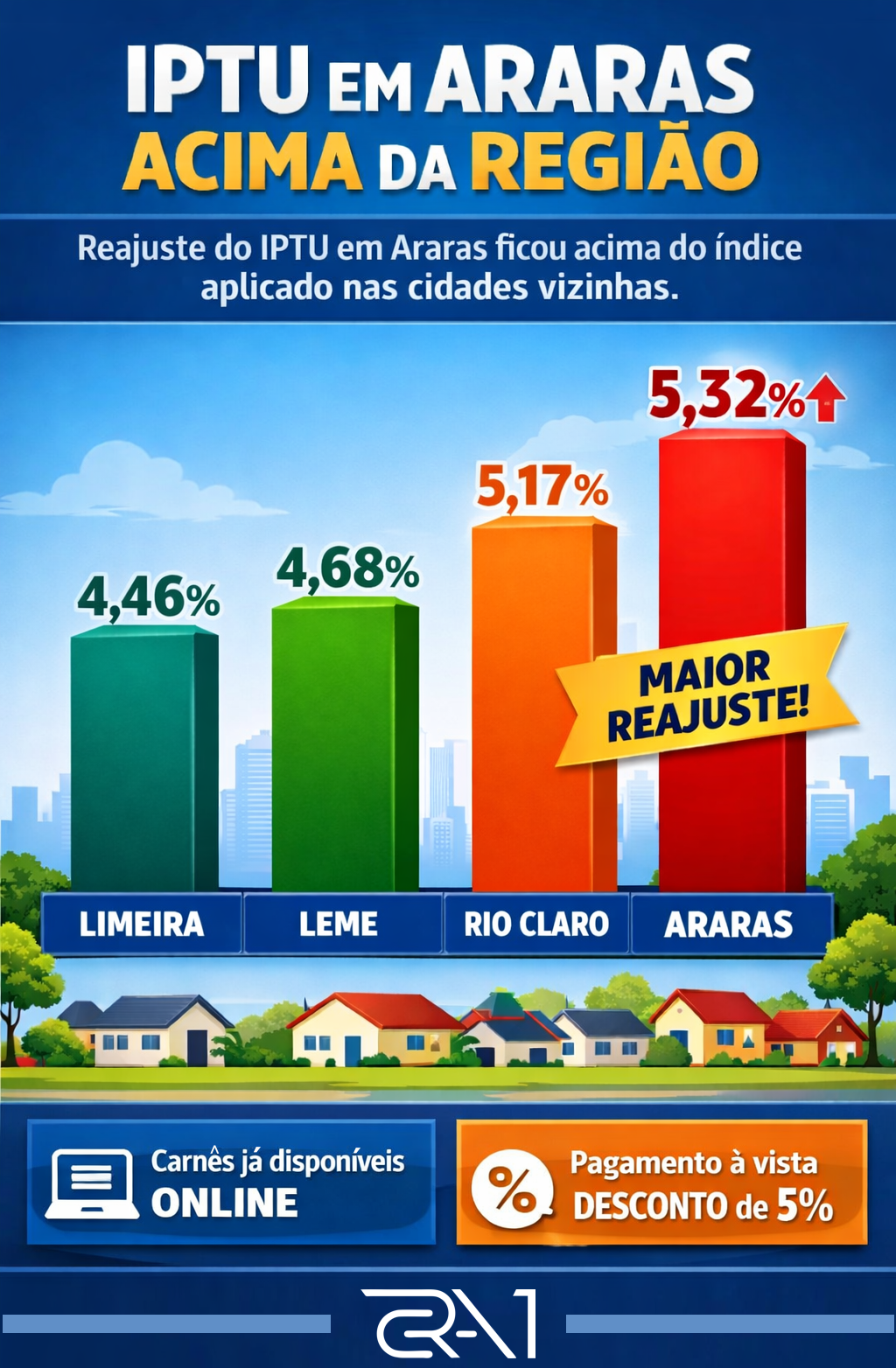 O reajuste do IPTU 2026 em Araras ficou acima dos índices aplicados por municípios vizinhos, segundo levantamento comparativo regional. Enquanto cidades próximas adotaram percentuais menores de correção, o aumento aplicado no município chegou a 5,32%.