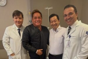 A informação foi compartilhada pela esposa do artista, Poliana Rocha, por meio das redes sociais. Na imagem, o sertanejo surge ao lado da equipe médica, em pé e sorridente, já no período de recuperação, com discreto inchaço na região dos olhos.
