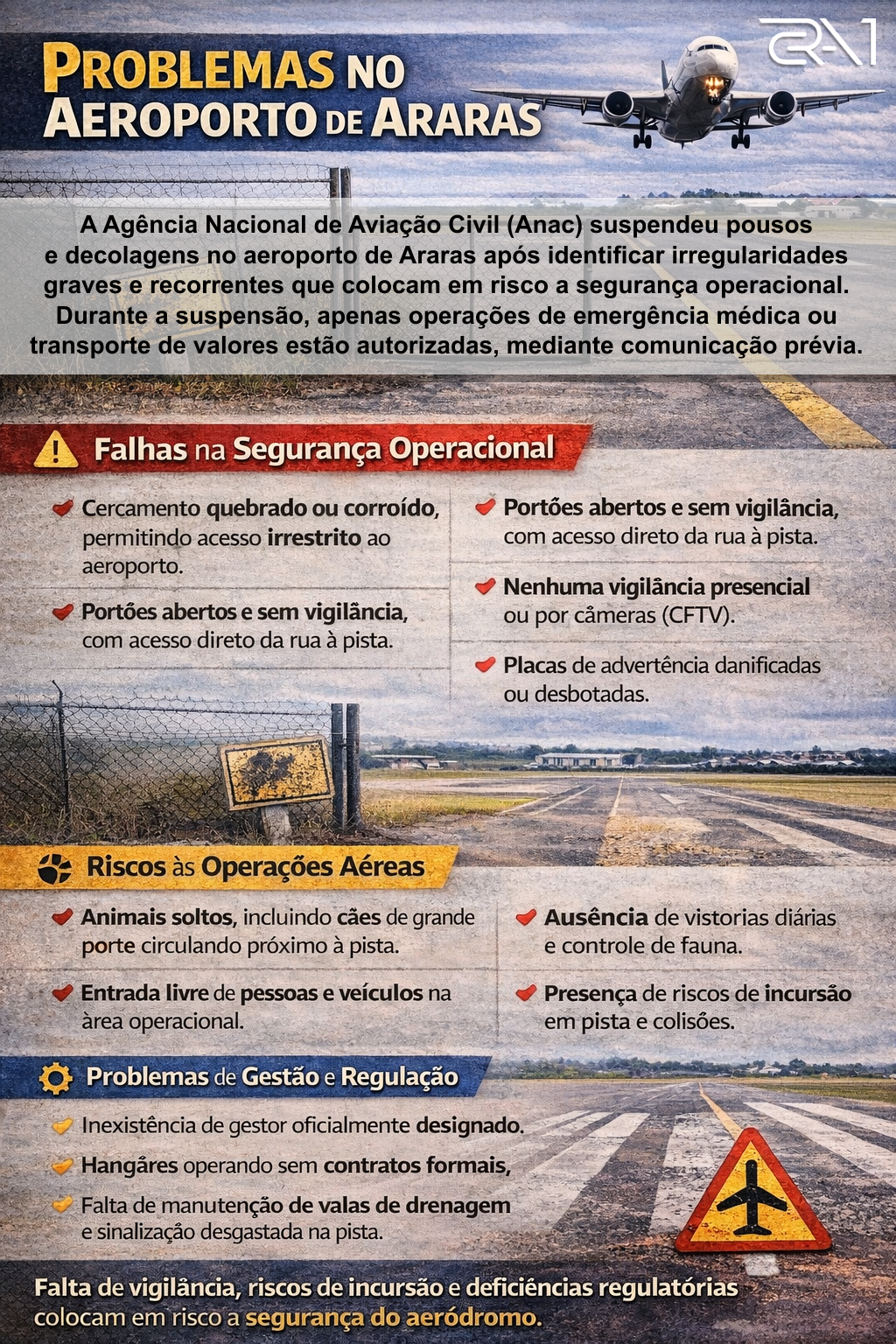 A medida cautelar da ANAC impede pousos e decolagens no aeródromo municipal desde janeiro de 2026, permitindo apenas operações médicas ou de transporte de valores, até que ajustes sejam implementados e comprovados pelas autoridades aeronáuticas.