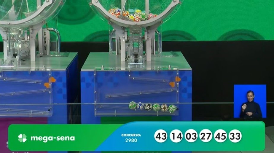 A Caixa Econômica Federal realizou nesta quinta-feira (5) o sorteio do concurso 2.980 da Mega-Sena, que tinha prêmio estimado em R$ 41.937.385,41. As dezenas sorteadas foram: 03, 14, 27, 33, 43 e 45. Nenhuma aposta acertou os seis números, e o prêmio principal acumulou.