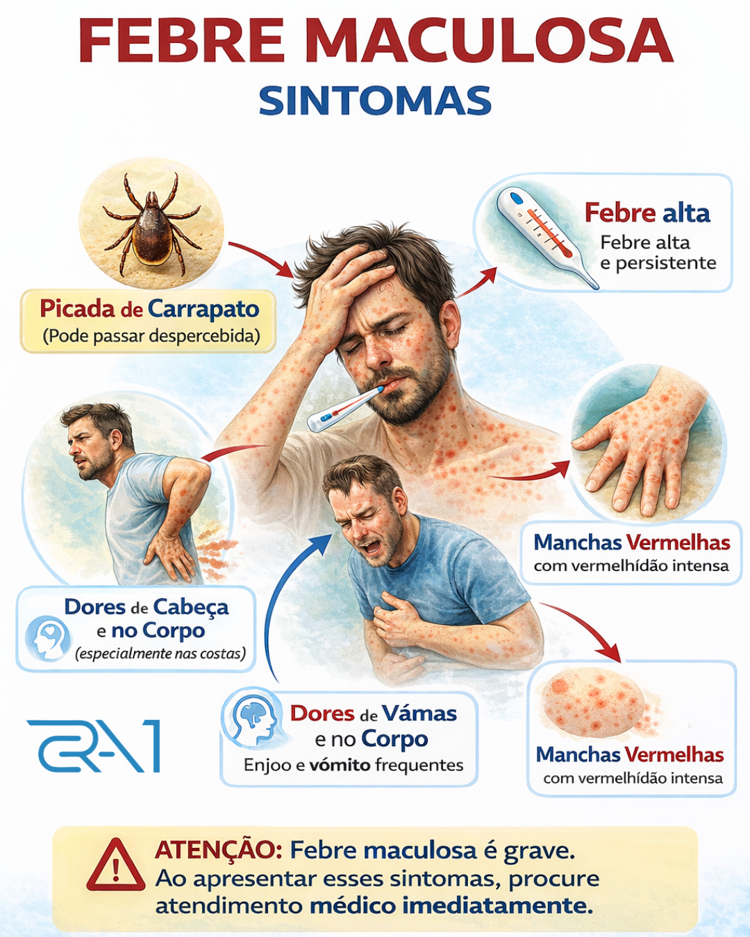 Os sintomas iniciais incluem febre alta, dor de cabeça intensa, dores no corpo, mal-estar e náuseas. Em alguns casos, surgem manchas avermelhadas na pele. A doença pode evoluir rapidamente, e o tratamento precoce é fundamental para evitar complicações graves.