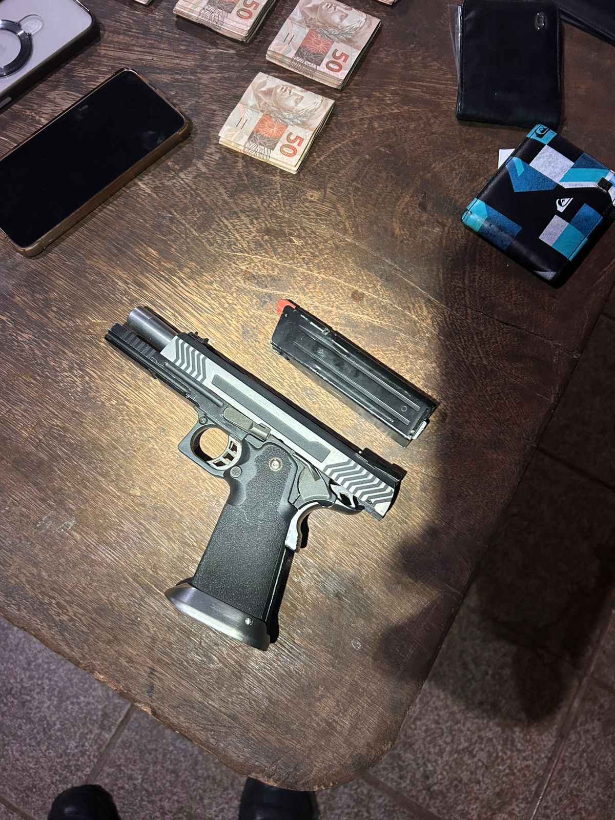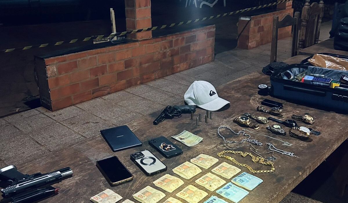 No local, os policiais apreenderam um revólver calibre .38 com numeração raspada, seis munições, um simulacro de pistola, R$ 13.535 em dinheiro, quatro aparelhos eletrônicos, oito relógios, cinco correntes e quinze frascos de perfume de diferentes marcas. Também foram recolhidos dois veículos utilizados pelos suspeitos: um Renault Sandero e uma BMW 320i.