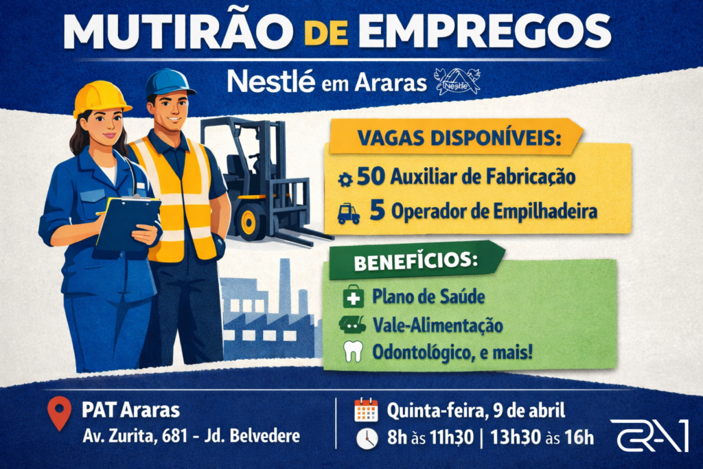 Quem está em busca de trabalho em Araras terá uma nova oportunidade nesta quinta-feira (9). A Prefeitura, por meio da Secretaria de Desenvolvimento Econômico, promove em parceria com a Nestlé um mutirão de contratação com 55 vagas disponíveis.