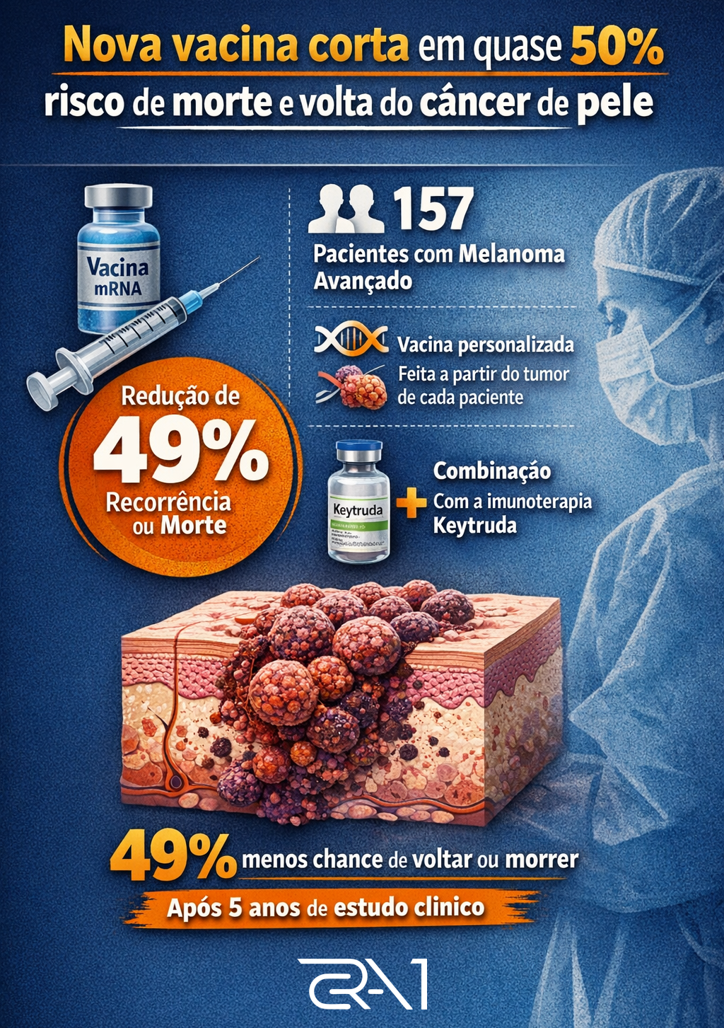 Uma vacina terapêutica desenvolvida com tecnologia de RNA mensageiro apresentou resultados positivos no combate ao melanoma avançado. Dados divulgados pelas farmacêuticas Moderna e MSD mostram que o imunizante, aplicado junto ao medicamento Keytruda, diminuiu em 49% o risco de recorrência da doença ou de morte após cinco anos de acompanhamento.