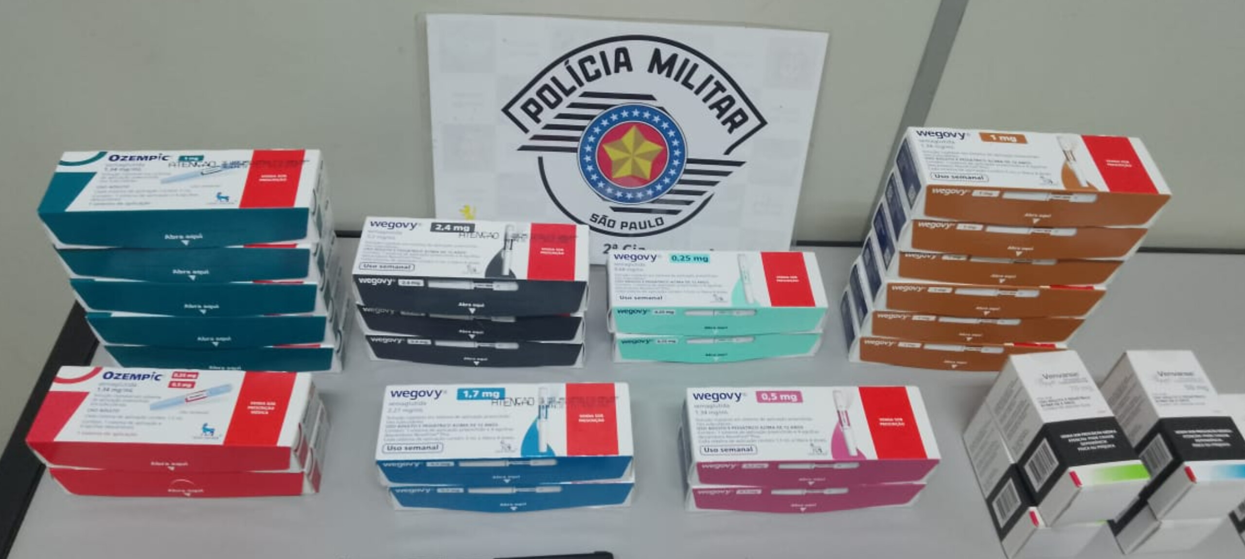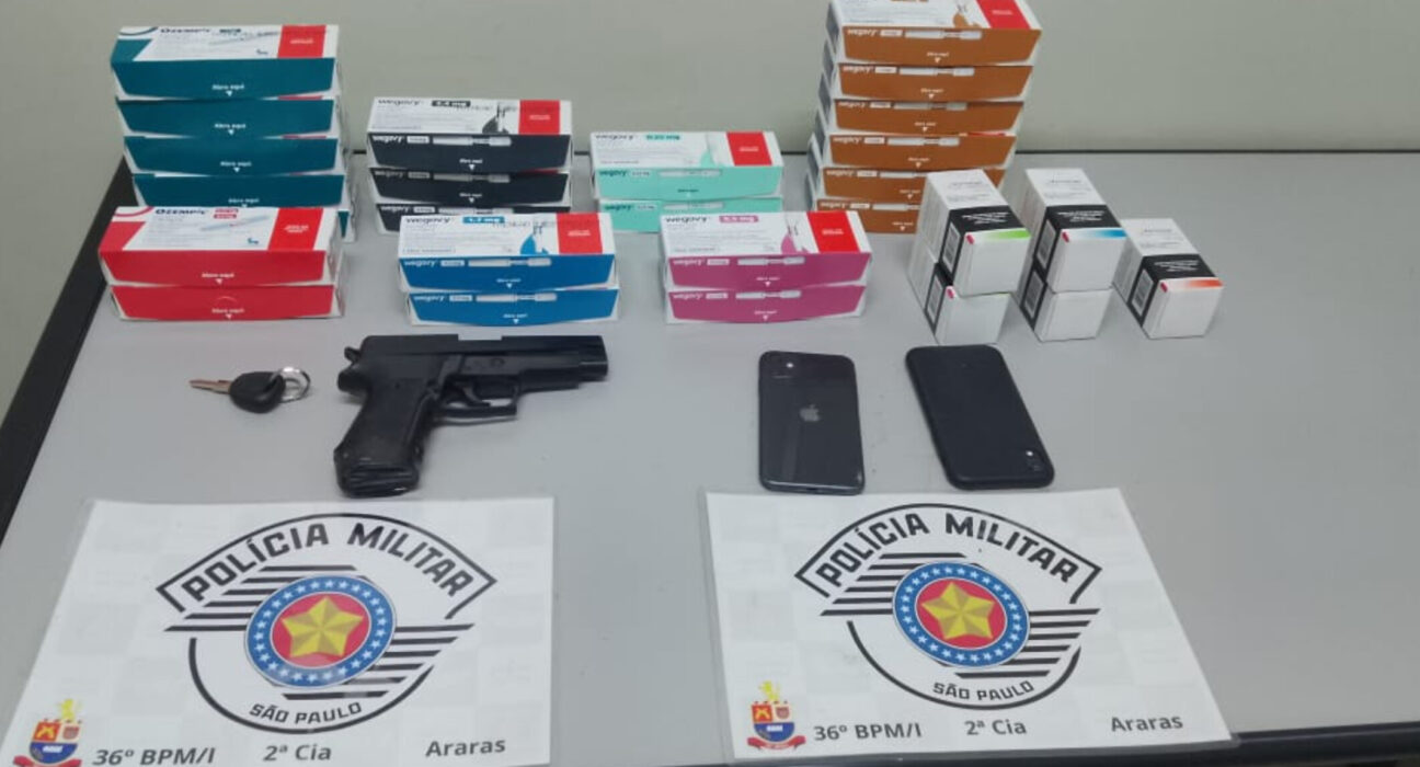 Um dos ocupantes conseguiu fugir pela mata, mas os três adolescentes foram detidos. Com eles, os policiais apreenderam um simulacro de pistola e recuperaram medicamentos avaliados em aproximadamente R$ 38 mil, entre eles caixas de Wegovy, Ozempic e Venvanse.