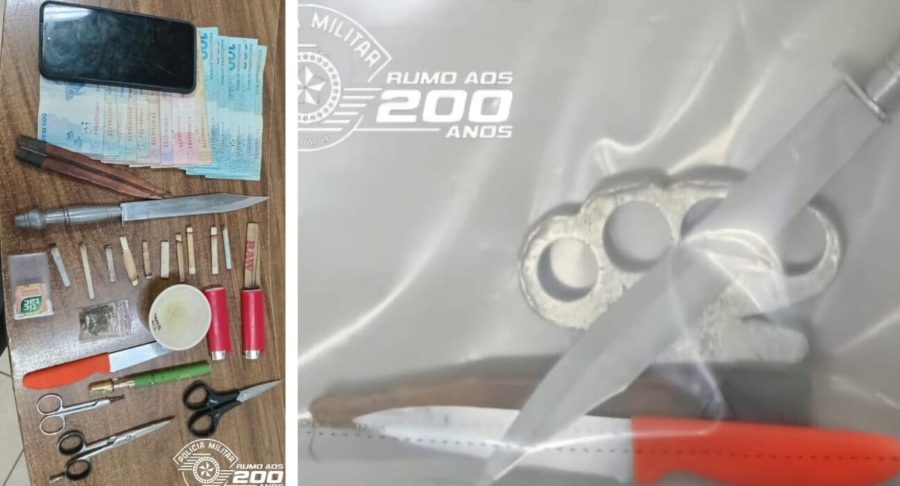 Segundo o boletim de ocorrência, a equipe abordou quatro pessoas e, com um dos suspeitos, maior de idade, encontrou duas facas, cerca de 0,006 gramas de maconha e a quantia de R$ 590,00. Já com outro indivíduo, um adolescente de 17 anos, foi localizado um soco inglês.