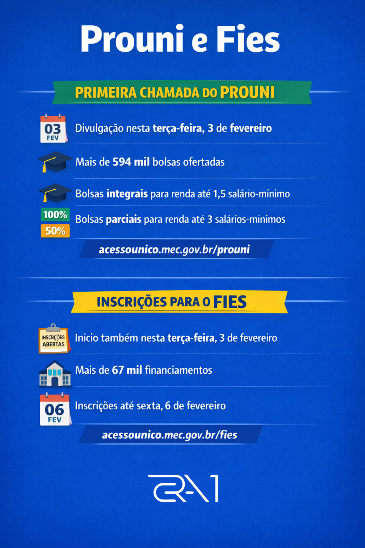 As inscrições para o Fies são gratuitas e seguem abertas até sexta-feira, 6 de fevereiro, pelo site acessounico.mec.gov.br/fies. Para participar, é necessário comprovar renda familiar bruta mensal por pessoa de até três salários-mínimos.