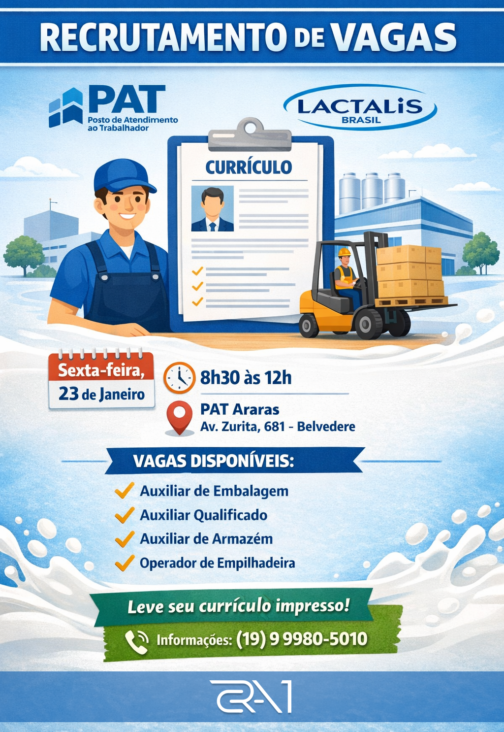 O PAT de Araras realiza hoje, sexta-feira (23), uma ação de recrutamento em parceria com a Lactalis Brasil para o preenchimento de vagas de emprego na unidade da empresa.