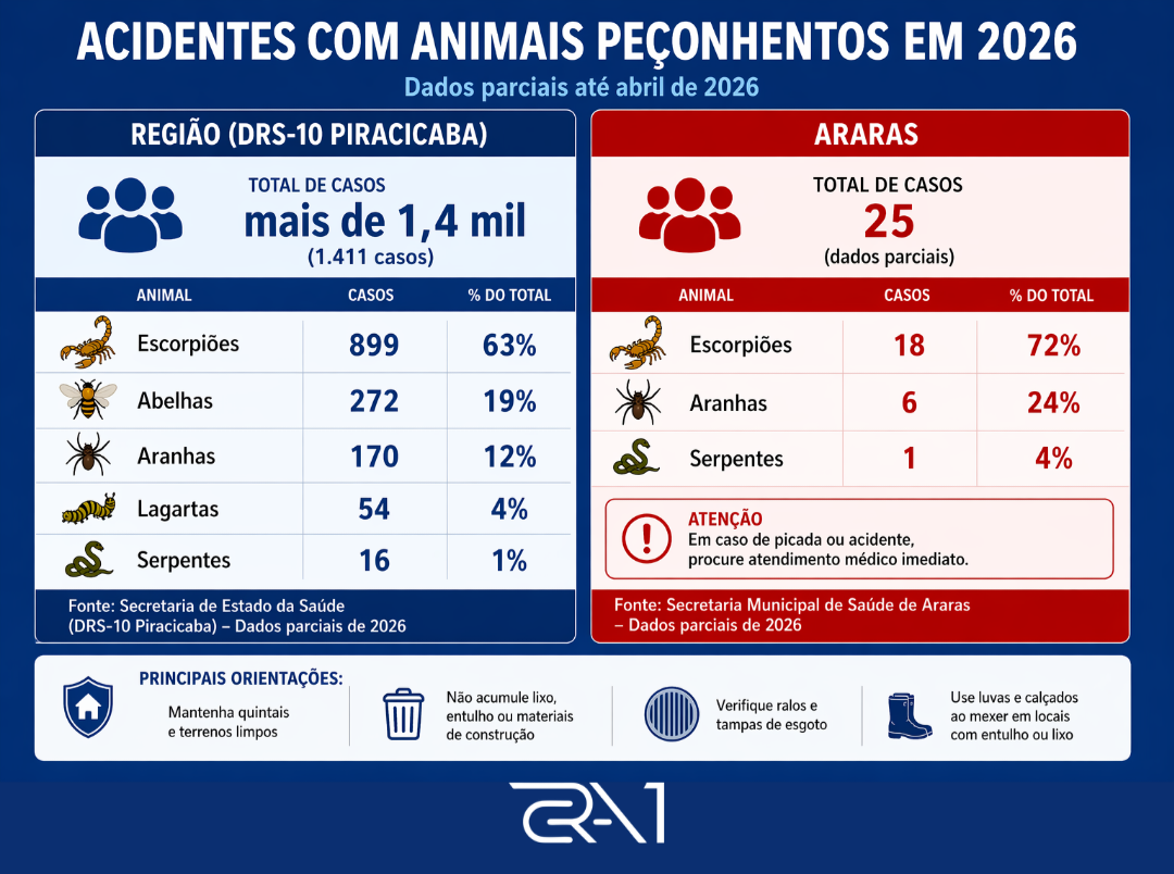 Os acidentes com animais peçonhentos seguem em alta em 2026 na região do Departamento Regional de Saúde (DRS-10), que abrange cidades como Piracicaba, Limeira, Rio Claro, Leme, Conchal e Araras. Ao todo, já são mais de 1,4 mil casos neste ano, segundo dados parciais da Secretaria de Estado da Saúde (DRS-10 Piracicaba).