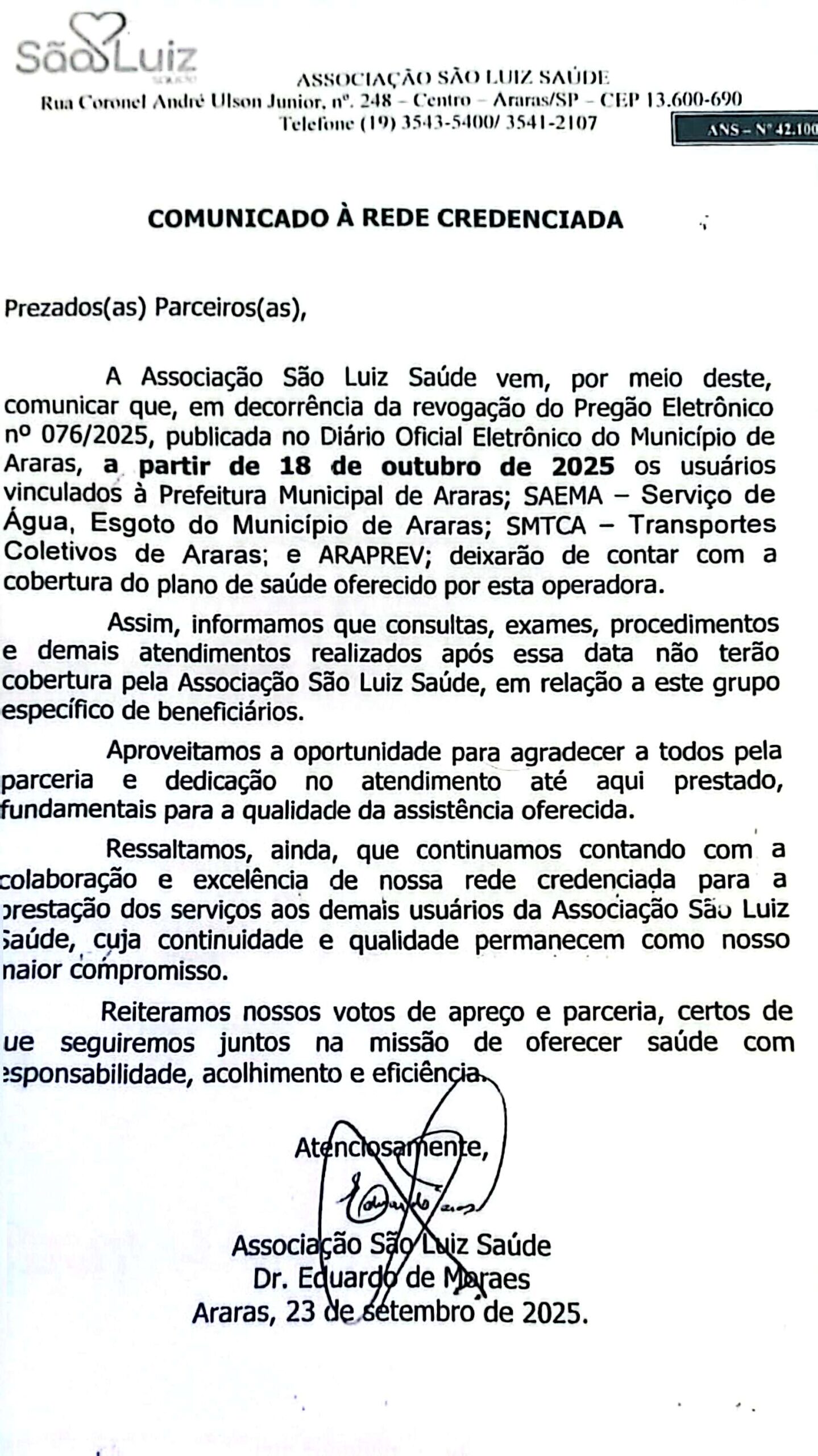 A Associação São Luiz Saúde comunicou oficialmente que, a partir de 18 de outubro de 2025, os servidores da Prefeitura de Araras e de autarquias municipais deixarão de ter cobertura pelo plano de saúde oferecido pela operadora. A decisão foi motivada pela revogação do Pregão Eletrônico nº 076/2025, publicada no Diário Oficial Eletrônico do município.