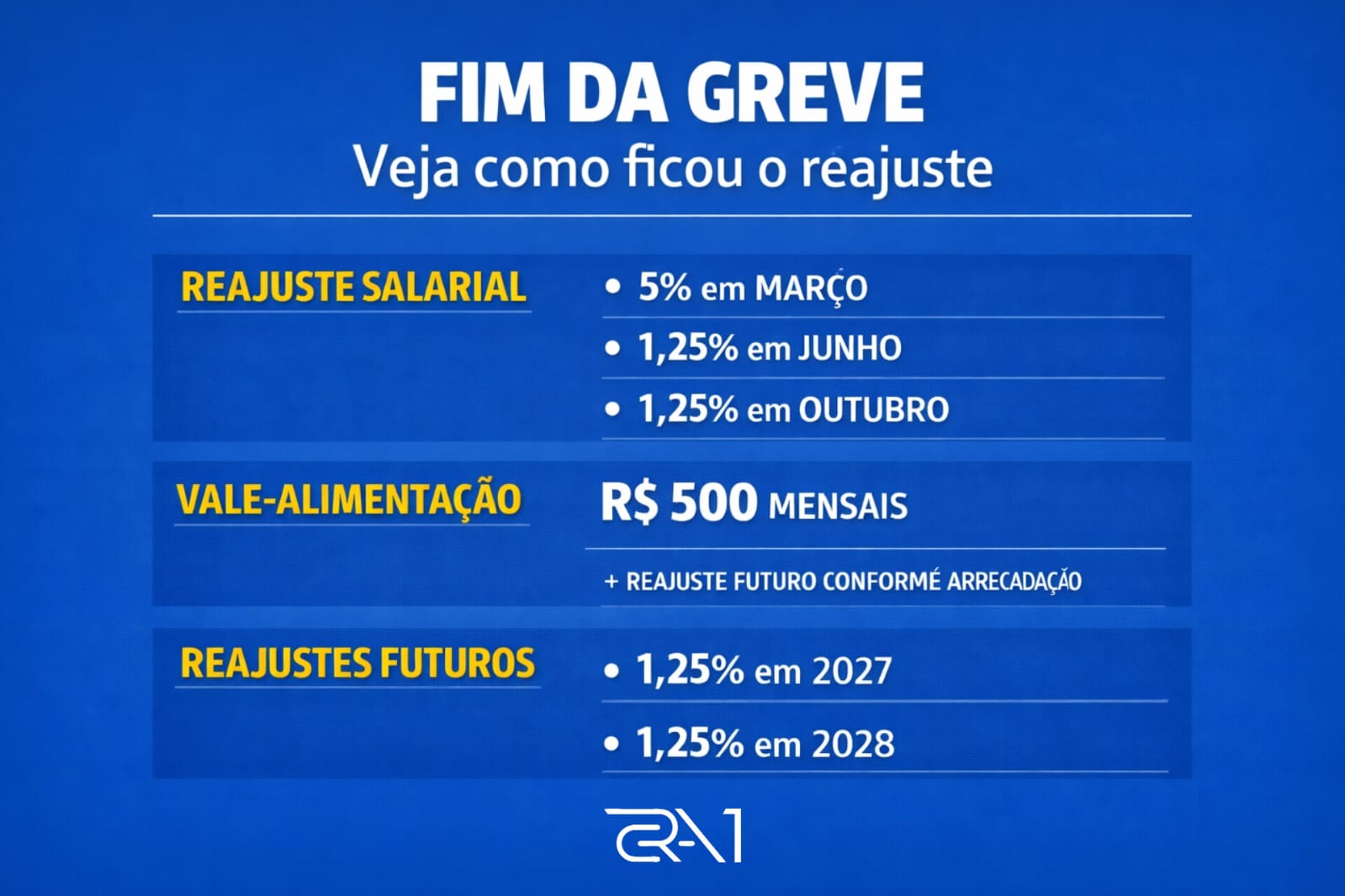 Também ficou estabelecido o vale-alimentação no valor de R$ 500, com possibilidade de reajuste nos próximos anos conforme a arrecadação do município. O acordo prevê ainda aumentos de 1,25% em 2027 e 1,25% em 2028, além das correções anuais referentes ao dissídio.