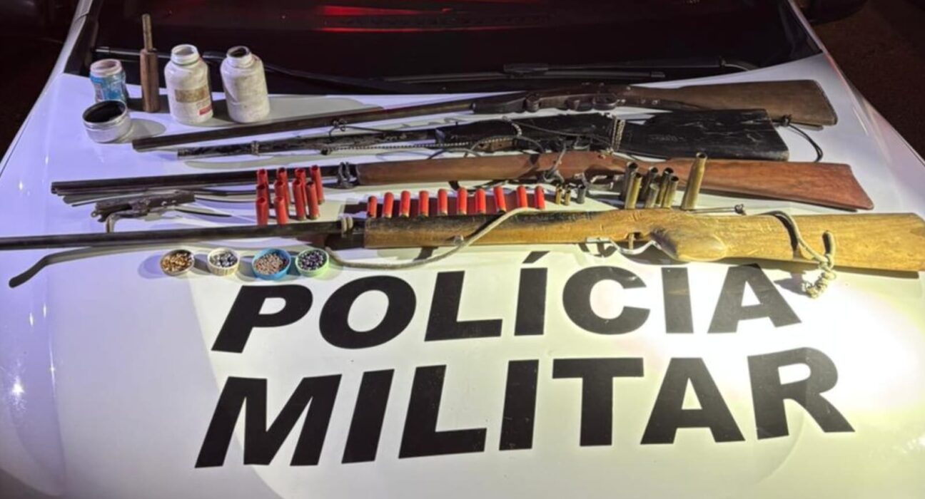 Foram apreendidas quatro espingardas calibre 32, cartuchos intactos e deflagrados, estojos de diversos calibres e materiais utilizados para recarga caseira de munições, como pólvora, espoletas e esferas metálicas.