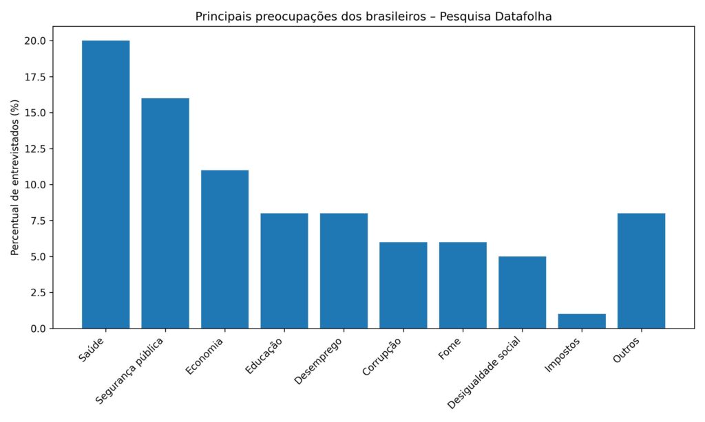 Na sequência, educação e desemprego são mencionados por 8% cada um. Corrupção e fome aparecem com 6%, desigualdade social com cerca de 5%, impostos com 1% e política não foi citada como principal problema por nenhum dos entrevistados. Outros temas somaram 8% das respostas.